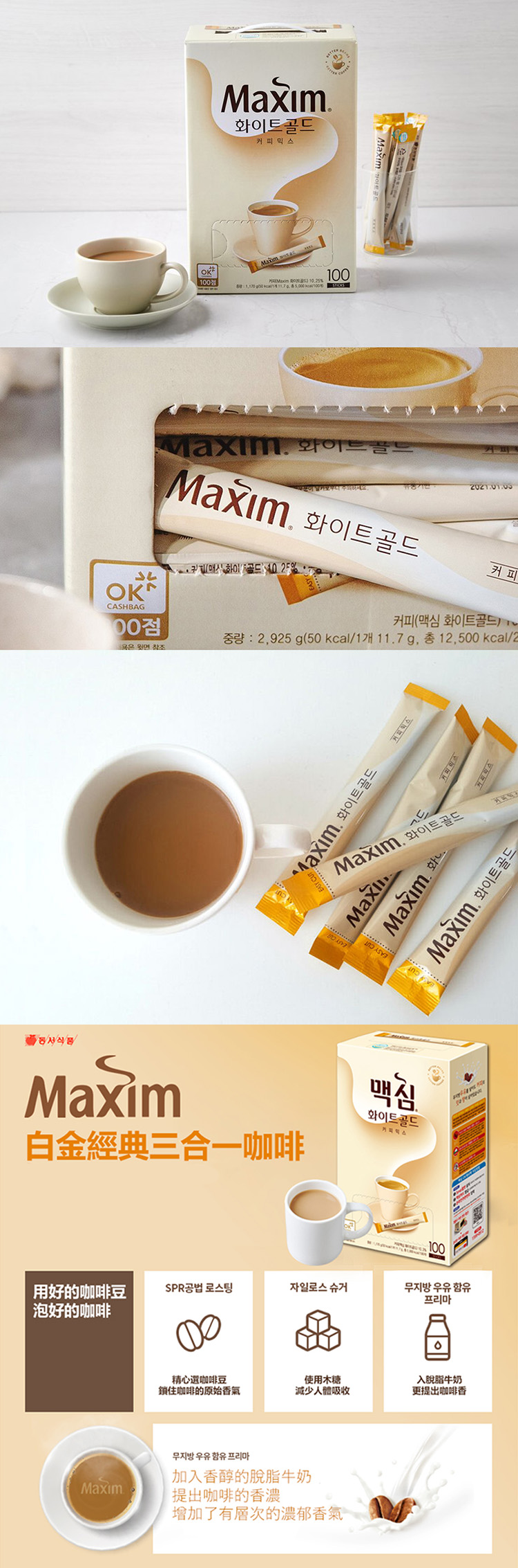 | 品名: | MAXIM Whitegold白金經典三合一咖啡1287g(11.7g×110入/盒) |